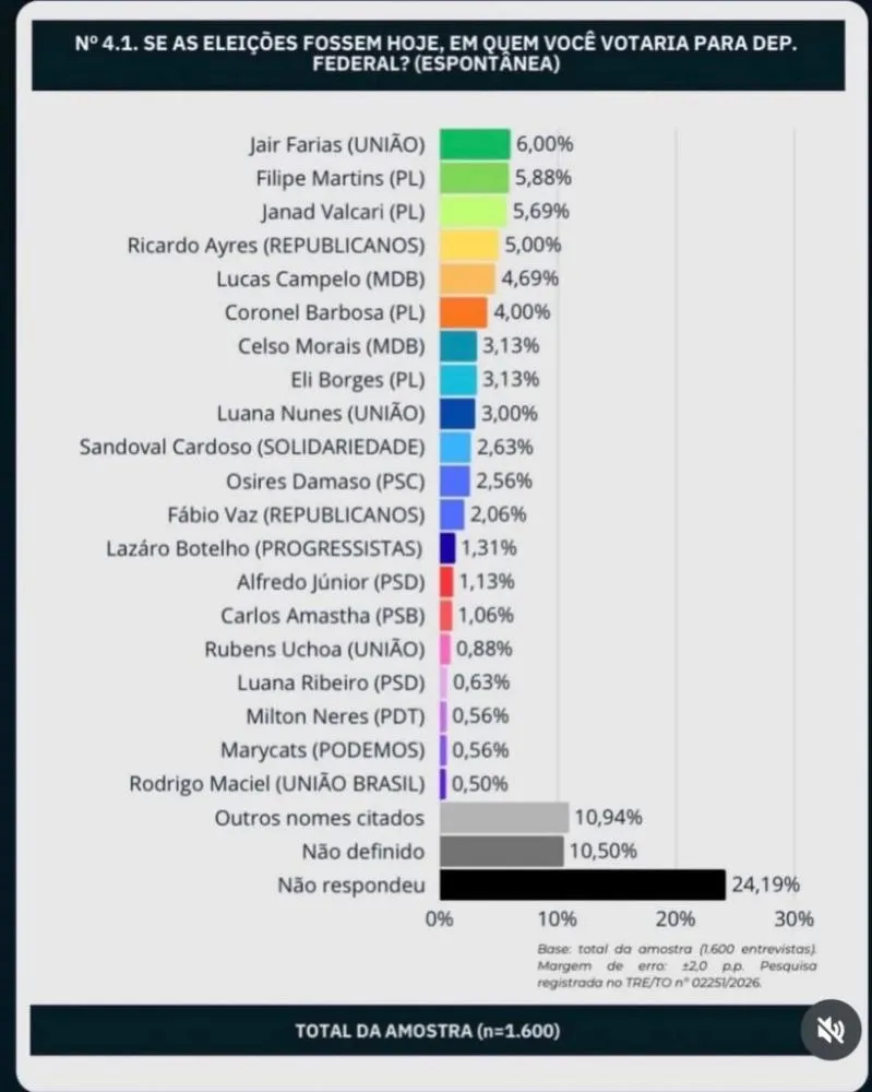 De acordo com levantamento do Instituto Lucro Ativo, registrado no Tribunal Regional Eleitoral do Tocantins (TRE-TO), Filipe Martins alcançou 5,88% das intenções de voto na pesquisa espontânea — quando o entrevistado responde sem receber lista de candidatos. O resultado o posiciona entre os primeiros colocados e indica um grau relevante de reconhecimento público em âmbito estadual.